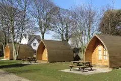 Chic pods which include a spacious kitchen with fridge and microwave inside and two sleeping areas. There is a double bed and single beds which convert into sofas provided.