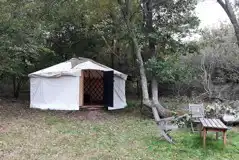 Furnished yurts with a double bed, two singles and a pull out mattress (bed sheets provided). Inside is a woodburning stove and an equipped kitchen area with crockery, cutlery, a kettle and a gas stove. Outside is a seating area with a fire pit and BBQ.