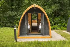 Basic wooden camping pods measuring 2.4m x 4.4m. Featuring two small single beds and one small double bed. Toilet block facilities are located a short distance away. Mattresses are provided, but please bring your own bedding with you.
