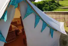 Chic bell tents which sleep two, including a comfy bed with electric, furnishings and a light and breezy interior. Sorry, no dogs.