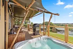 These glamping tents offer 360 degree views across the park, complete with kitchenette and ensuite shower and WC. Outside, you'll find a BBQ area and a relaxing hot tub. This accommodation sleeps 4-6.
