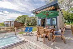 A lodge style studio pod cabin with king size sofa bed, shower and living/dining area with Bluetooth speakers. There's a kitchen and French doors leading to a verandah with garden furniture and outdoor hot tub. Wonderful countryside views. Sorry, no pets
