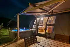 A bespoke safari tent with a four poster double bed and galley kitchen, plus a woodburning stove and furnishings, sleeping 4-6. There's a large verandah with garden furniture and sunken outdoor hot tub. Perfect for a romantic getaway.