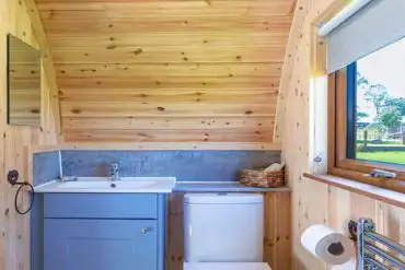 Luxury glamping pod with a comfy double bed, optional sofa bed, ensuite bathroom, well-equipped kitchenette and a lounge area. WiFi and underfloor heating are available throughout the pod. Outside is a fire pit/BBQ and picnic table. Dog friendly.