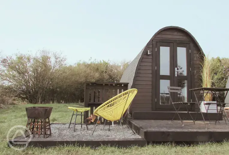 The campsite is based within roughly ten minutes' drive of Alnwick and around four minutes from the ancient St Oswald's Way which offers lovely views. Explore the harbour at Craster (10 minutes) or try some watersports on the sandy beach at Alnmouth, also ten minutes away. Grassed pitches are reinforced with mesh or there are a set of hardstandings too which will suit motorhomes and campervans. For those travelling without a tent, hiring a comfy bell tent is ideal. Each bell tent comes furnished with a double bed, chair beds and a handy campers kitchen. A perfect way to travel light! The site is also home to three cosy self-contained glamping pods with their own WC and sink. These pods sleep either up to three adults or two adults and two children on a standard double bed and small double sofa bed, with access to a 6amp electric supply. There's a campers kitchen with gas hob, kettle, crockery and cutlery, with tea and coffee also included. Outside the pod, you'll find a small decking area with seating and a fire pit. This family friendly site allows dogs, campfires and off ground BBQs.