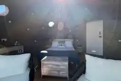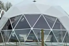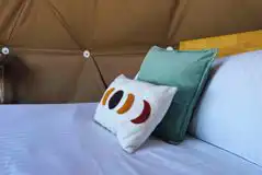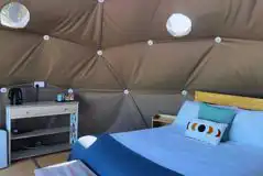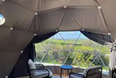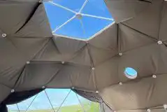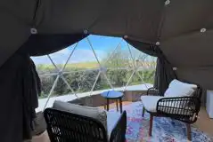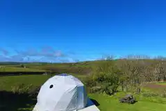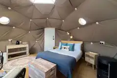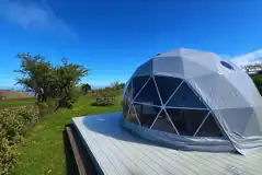 Geodome (5m x 3.5m) with a double bed, bedding, electricity, gas, heating, a fridge, kettle, WiFi, and power sockets. There is a patio and outside furniture. Shared facilities are nearby. Please bring towels and cooking equipment. Dogs welcome.