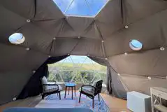 Spacious geodome (5m x 3.5m) with a double bed, duvets, pillows, bed linen, WiFi, electric, gas, heating, a fridge, and a kettle. Shared facilities are available nearby. Please bring your own towels and cooking equipment. Outside is a patio and furniture.
