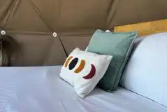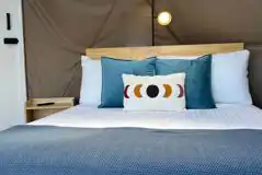 Cosy camping pods with a double bed. There's also a sofa, bedside tables, and seating outside with incredible views. Linen and towels must be brought with you or added an extra. Dogs welcome.