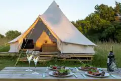 Bell tent equipped with a double bed with bedding, two futon sofa beds, linen soft furnishings and a tea light chandelier. Tents are spaced 15m apart for privacy. Dogs welcome.