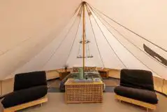 Bell tent equipped with a double bed with bedding, two futon sofa beds, linen soft furnishings and a tea light chandelier. Tents are spaced 15m apart for privacy. Pet free.