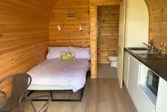 Ensuite glamping pod with a small double bed, a kitchenette with a fridge, microwave, stove, kettle and toaster, a TV, seating, USB charging and a toilet and shower. Outside is a picnic bench and fire pit. Dogs welcome. Bedding and towels included.