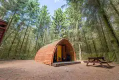 The Ark glamping pod, set in the middle of conifer trees with a double futon and two single futons (please bring your own bedding). The pod's clearing has decking, kitchenette, toilet facilities and a picnic area. One dog welcome.