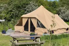 A traditional glamping unit, perfect for two adults and two children. Featuring a double bed and two single mattresses. Outside there is a bench and firepit. Sorry, no pets. Shared facilities nearby.