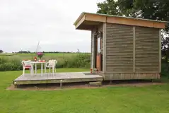 Ensuite glamping lodge complete with a king sized bed, ensuite and an open plan living area with seating and a wood burner. The kitchen has a hob, combi-microwave grill and fridge. Outside is a patio with seating, a BBQ and a larger shared kitchen.