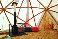 StarDome is a mix between a yurt and a geodome. Fully furnished with a wooden floor, it sleeps five in a double bed, bunk beds and a single futon. Outdoor covered seating and a fire pit with tripod and grill. Shared WC and shower facilities nearby.