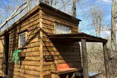 Off-grid cabin in a private area with a small double bed and bedding, space for a travel cot or an airbed for a child. Includes gas, cooking utensils, crockery, kettle, outdoor decking, seating and fire pit. Shared facilities nearby, dogs welcome.