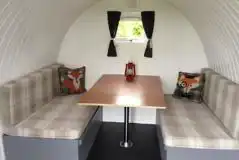 Two pods with a double bed for two guests which converts into a dining area. Outside is a fire pit, bench and a covered cooking area equipped with a double burner stove, saucepans, crockery and all the essentials. Sorry no dogs allowed inside the pods.