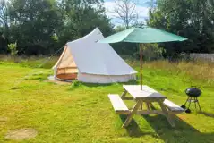 Situated along a quiet country lane, this site welcomes tents and small campervans on a small range of pitches which all include electric. There's a selection of grass and hardstandings spread across the meadow here, which is also a haven for spotting wildlife. Barbecues welcome provided they are off the grass. Leave the tent at home and choose a hassle free bell tent. These are pre-erected and ready for you to bring your bed and other bits along. Alternatively, the shepherd's hut enjoys a tranquil setting nestled against the trees and sitting on the edge of a wild meadow with the stream running gently behind it. Fully equipped with a double bed, bunk bed, seating and cooking utensils - sleeps up to four. Book the Fisherman's Cabin for shelter and comfort for four, with a kitchen area, bed and bunk beds supplied inside. Previous runner-up of the "Best Small Campsite" award! Sorry, no pets or motorhomes.
