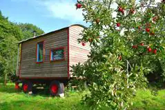 Sleeps two in a furnished double bed the Orchard Wagon has a well equipped kitchen, electricity and wood burner. Outside terrace and fire pit. Tucked in an apple orchard and surrounded by nature. Shared toilet and shower facilities nearby. Sorry, no pets.