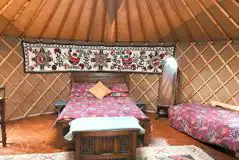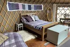 Inside, a double bed, two single sofa/futon beds and one single Z-bed, bedding included. Also, a dining table and cosy wood-burning fire. Nearby, your own camp kitchen complete with hob, kettle and utensils. Private eco toilet and shower. Sorry, no pets.