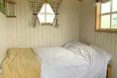 Sleeps up to four on a small raised double bed (4ft x 6ft 3) and chairs converted into single beds. Outside is a private decking area with seating and a fire pit. Please note, there is no electric. Please bring your own bedding. Shared facilities nearby.