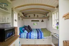 Sited on the main camping field, a shepherd's hut fitted out with a large double bed, wardrobe, microwave, kettle, toaster, fridge, radio and heater, the fitted dresser is also kitted out with utensils and crockery. No pets allowed.