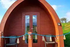 Heated pod, equipped with a double sofa bed, small table and fold up chairs, and a kitchenette with microwave. There is also a decking area outside with table and chairs. One small to medium sized dog is welcome.