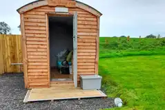 Heated shepherd's hut, equipped with a double sofa bed, small table and fold up chairs, and a small kitchenette with microwave. There is also an outside seating. One small to medium sized dog is welcome.