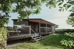Timber-framed cabin with double glazed glass doors opening up onto the decking with countryside views. Well insulated, with central heating and a log burner, there's also a fully equipped kitchen and spacious shower room.