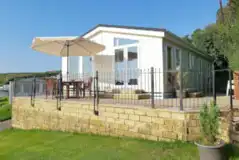 Set at the top of site with panoramic windows out to the coast and countryside. Equipped with a king sized bed, two singles, a kitchen and living area. Outside is a sauna, a patio, BBQ and a lawn. No pets allowed.