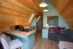 Heated glamping lodges complete with a comfy corner sofa, breakfast bar, kitchenette with a job, kettle, microwave, oven and crockery and cutlery. There's a separate double bedroom and an ensuite shower room. Outside is patio furniture and a BBQ.