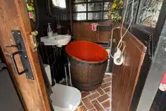 Features two king sized beds (bedding included) and an ensuite bathroom with toilet and bath/shower. Kitchen with a small fridge/freezer, kettle, furnishings, wood-burning stove, living area, and TV. Outdoor decking, fire pit, and seating. Dog friendly.