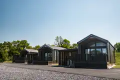 Lodges with a double bed, a twin bed and a small double sofa bed. There is an ensuite with a shower and toilet. An equipped kitchenette with a gas oven, microwave, fridge, and freezer. The living area has a TV, WiFi, heating, and gas. Outside a hot tub.
