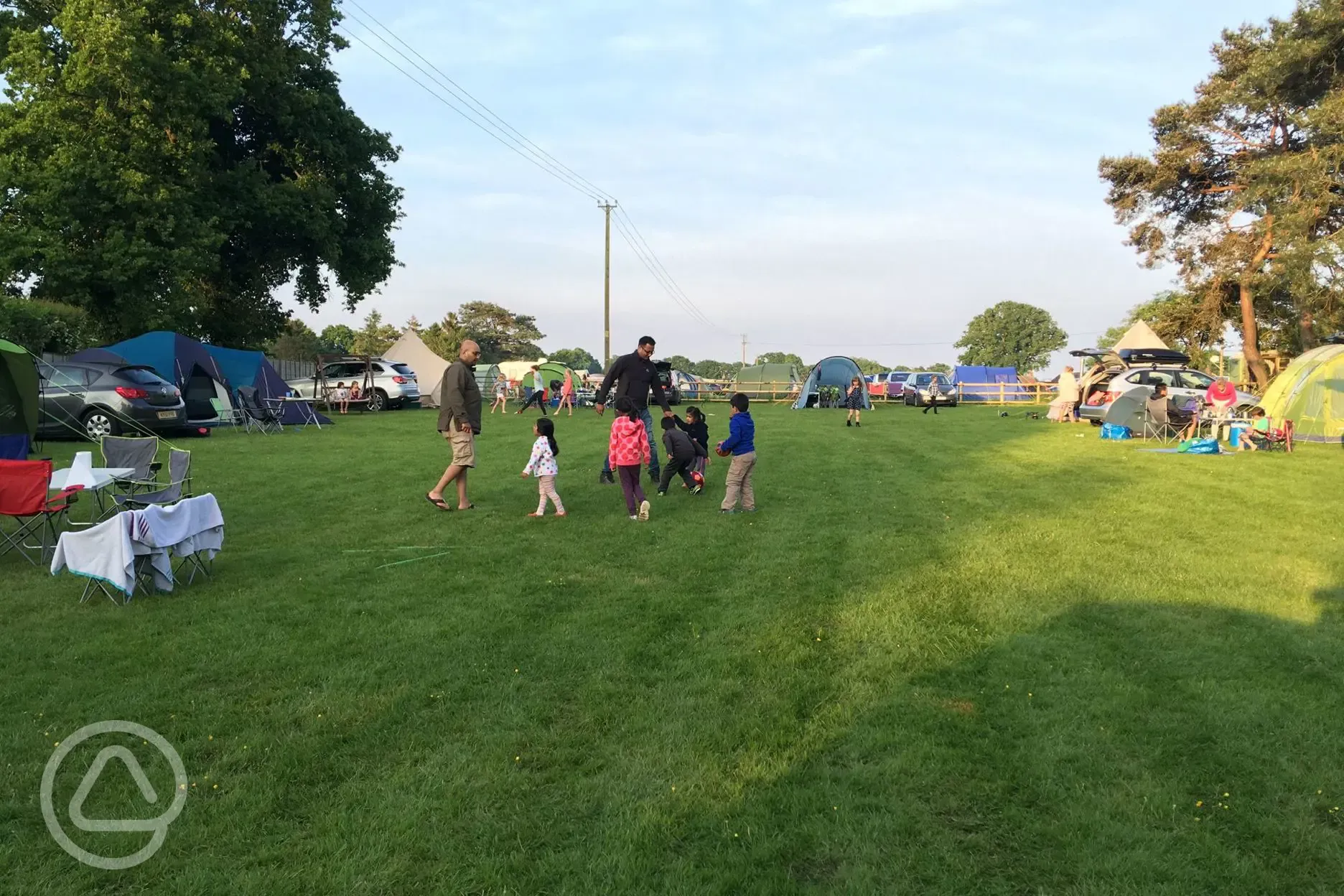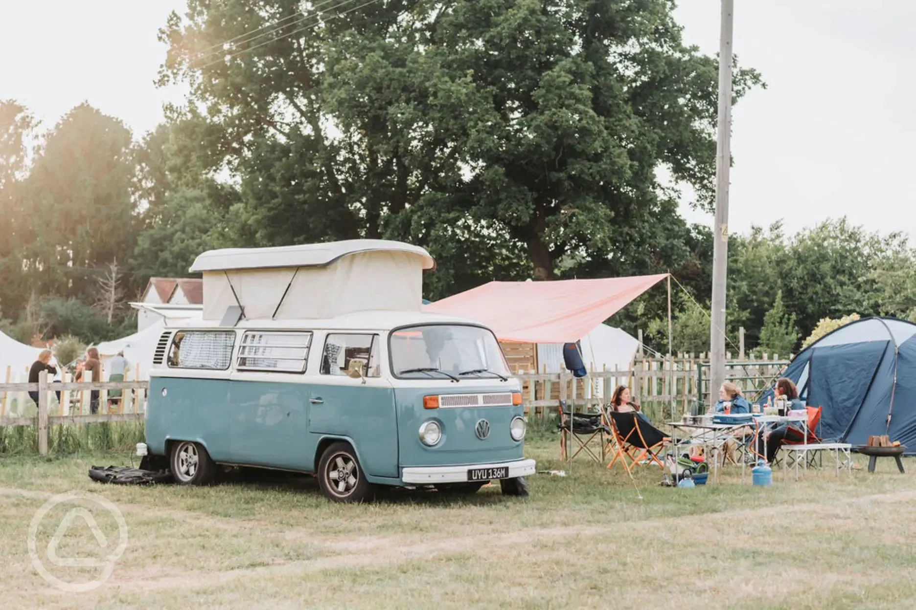 Grass 10m x 10m pitches on a level field, without electric. Pitches are suitable for tents, campervans, roof tents and trailer tents only.
