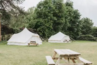 Camping and glamping with onsite food and drink, a three minute drive to a river for swimming