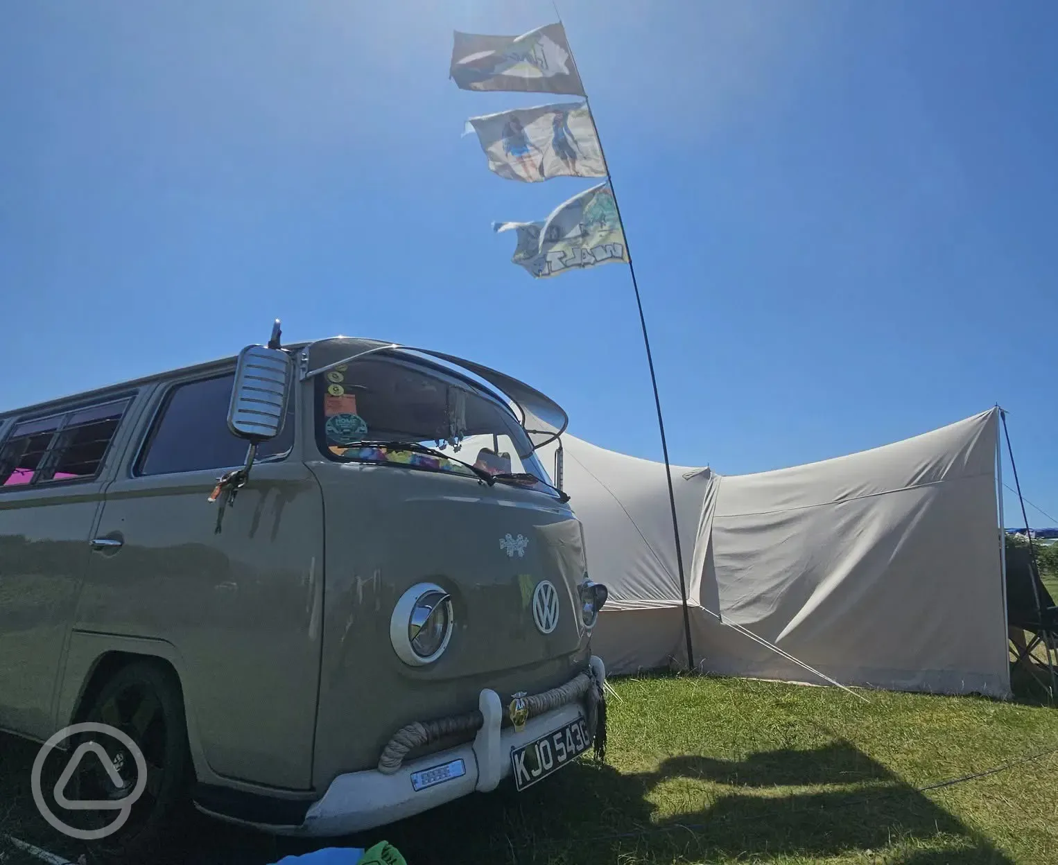 Spacious grass pitches suitable for tents, campervans and motorhomes.