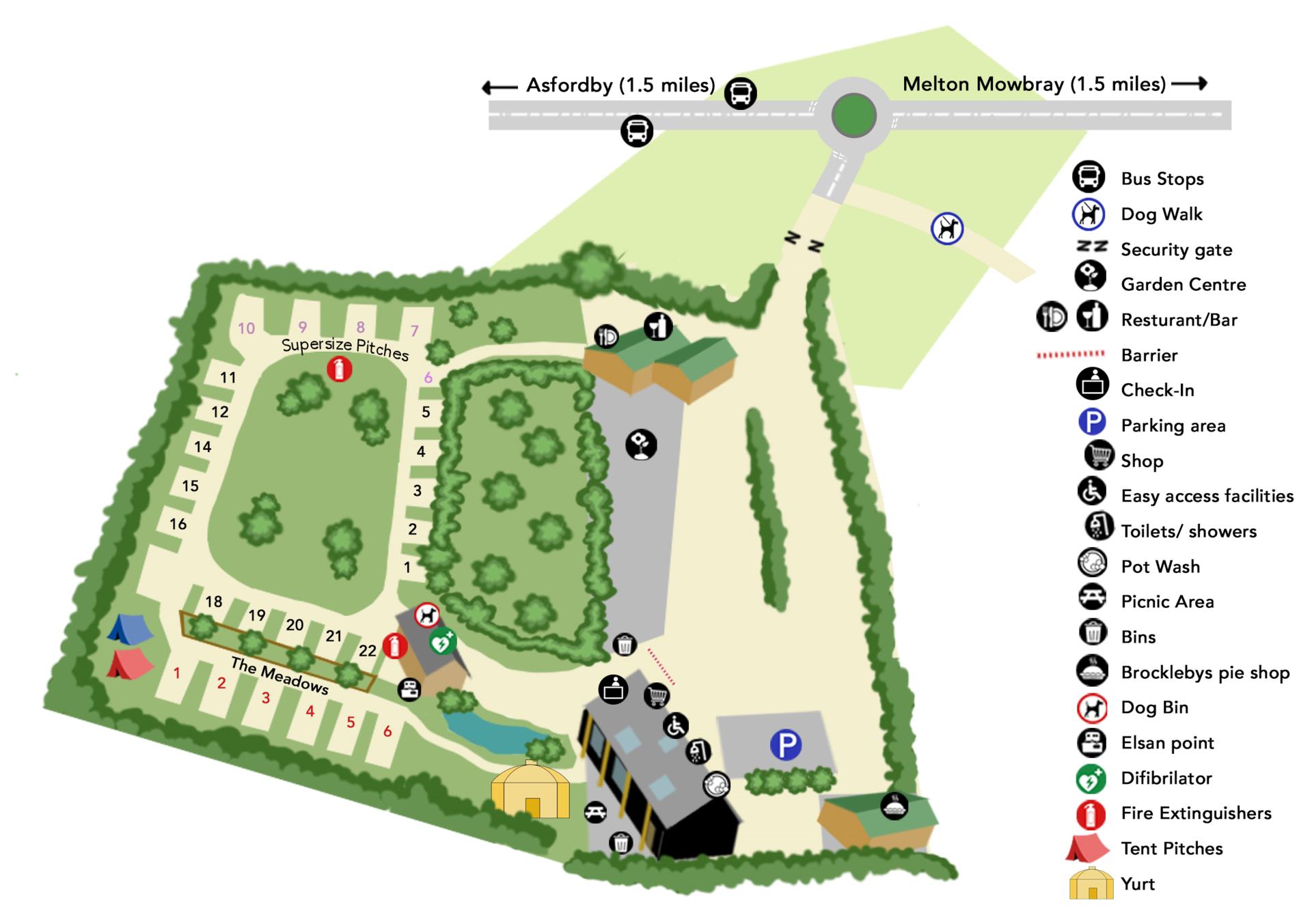 This adult only (15+) site is located on the multi award winning Grange Garden Centre complex, set in the Wreake Valley. Guests can also visit the Mountain Restaurant (open daily) for a tasty breakfast, lunch or afternoon treat! For tent campers, there are four unallocated pitches on a separate field. These come with metered electric hook ups. For campervans, caravans, roof tents and motorhomes, there are 26 hardstanding fully serviced pitches ranging from standard (9m x 8m), supersize (up to 17m x 9m) to the deluxe (10m x 10m) pitches with private picnic benches. These pitches have metered 16 amp electric, grey water disposal, mains water and free WiFi. The Mongolian yurt offers a cosy stay for two. It comes with a comfy double bed (bedding and towels provided), tea, coffee, milk, a small fridge, microwave, furniture and an electric fireplace. A bus stop is ideally situated at the end of the drive (a five minute walk away). From here, you can pick up services to Melton Mowbray, Grantham, Leicester and Loughborough. Nottingham is also just a 35 minute drive away. Four-legged friends are welcome to join you on your stay and also in the Mountain Restaurant. Gas BBQs are welcome onsite, but disposable BBQs or fire pits are not permitted. You can also purchase Calor Gas at the onsite shop.