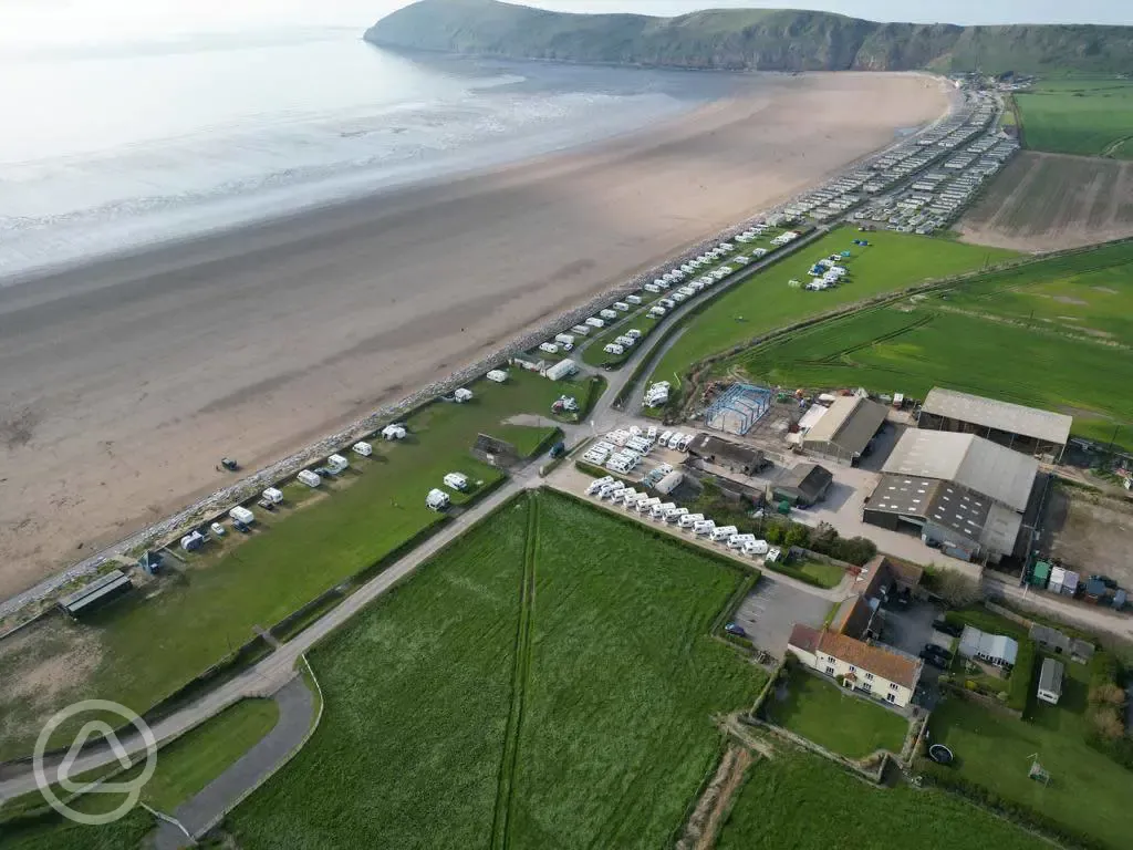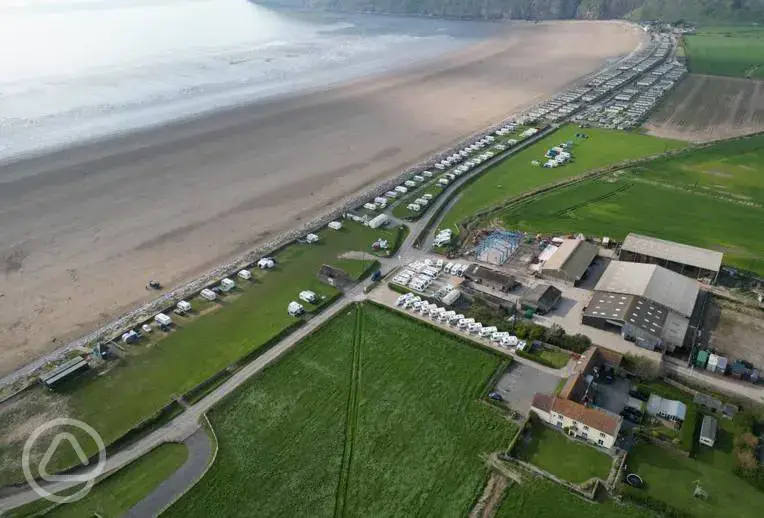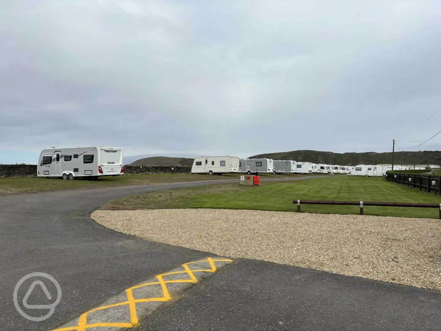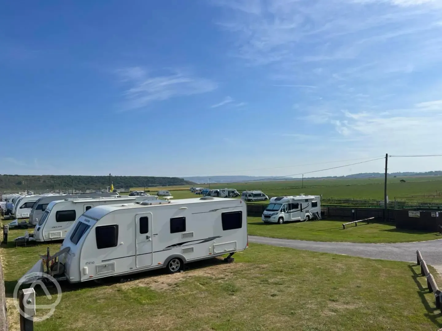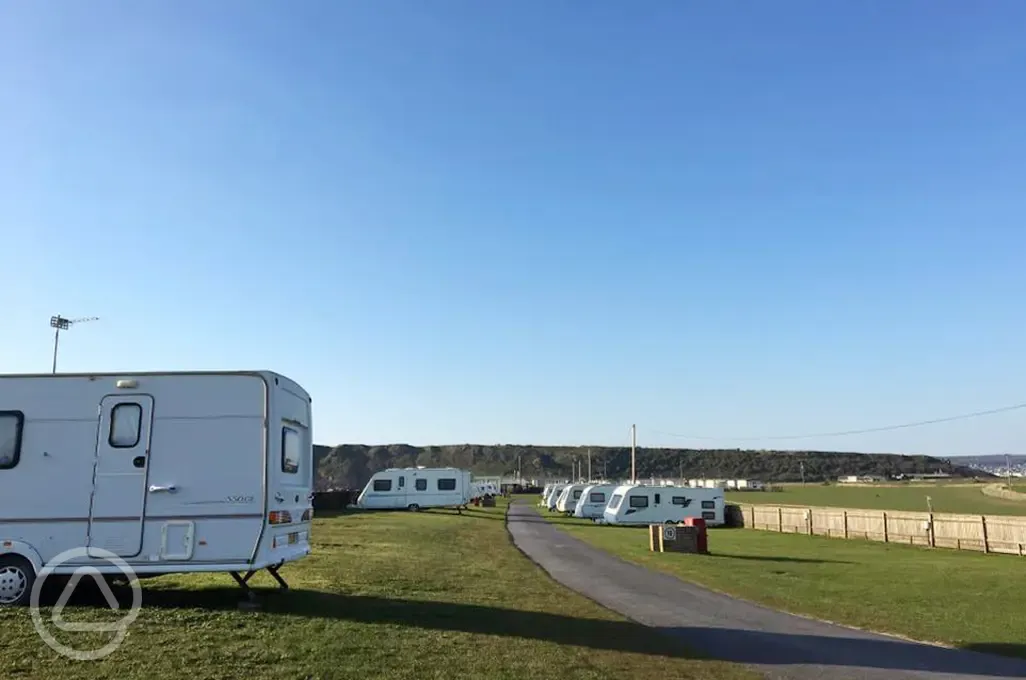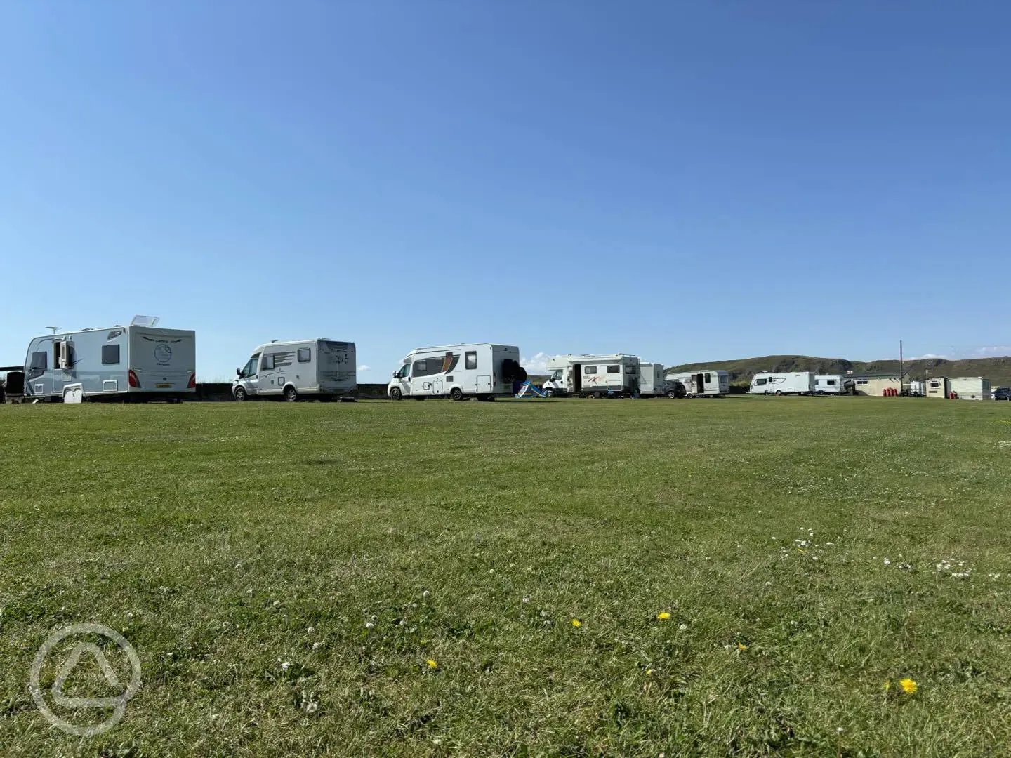 Grass pitches with electric boasting views overlooking the coast and catering for caravans and motorhomes with fixed awnings only.