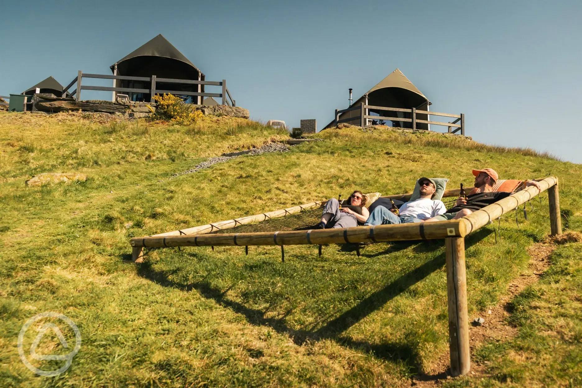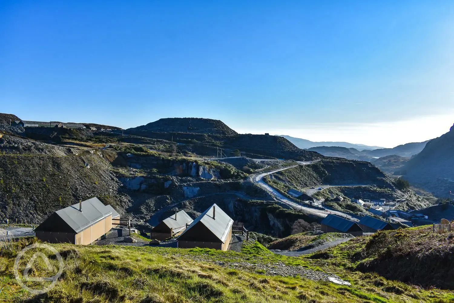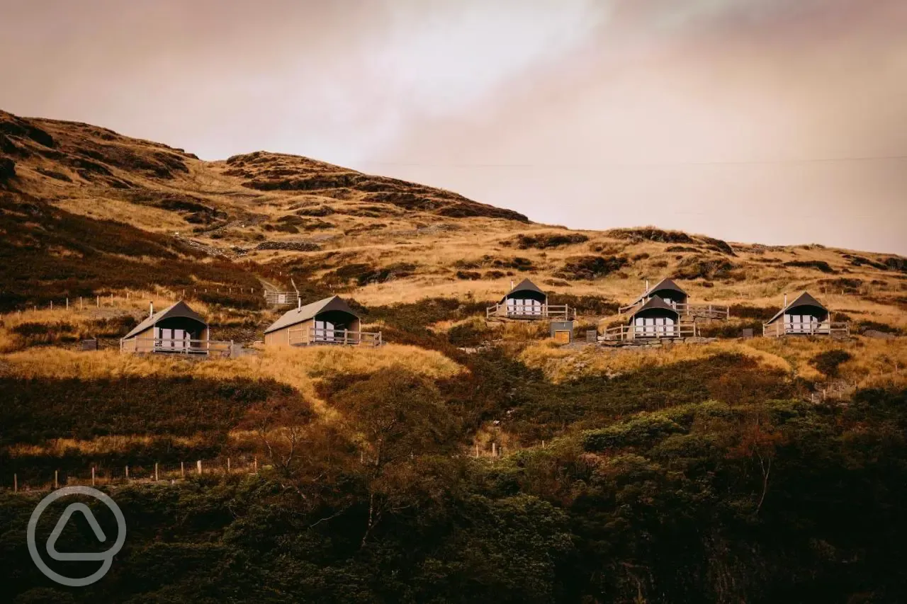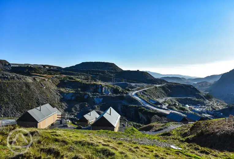 This adventure glamping option offers a beautiful location in a rugged landscape filled with amazing views and extraordinary industrial heritage, just five minutes from the historic town of Blaenau Ffestiniog. The tents combine the traditional aesthetic features of a tent, with the integrity and warmth of a cabin. A destination for adventurous visitors looking for somewhere comfortable to stay, the tents are situated on a spectacular, steep hillside overlooking the moorland, valleys and historic quarries of Blaenau Ffestiniog. The six tents sleep four or five people and include all you need. They are fitted with insulated wooden walls to cocoon you from the elements. You can experience all the comforts of home - from solid wooden floors, comfortable and welcoming beds, to showers and flushing toilets. There are even places to charge your phones, laptops and GoPros, and a cosy wood burner. These Glamping Tents are right at the heart of North Wales' most exciting tourist attractions - handy for exploring Eryri (Snowdonia) (40 minutes), Zip World (2 minutes) and Antur Stiniog (2 minutes).