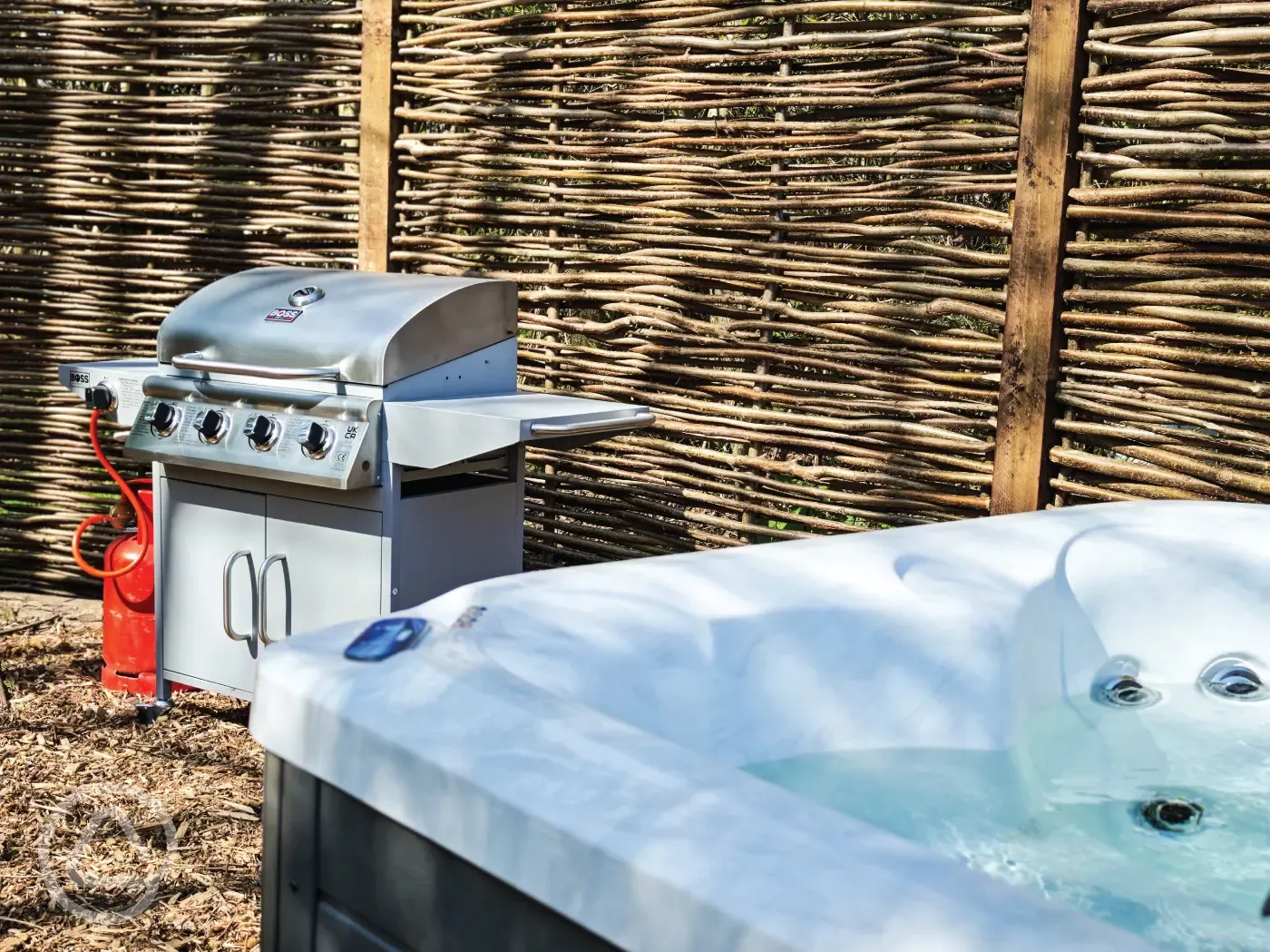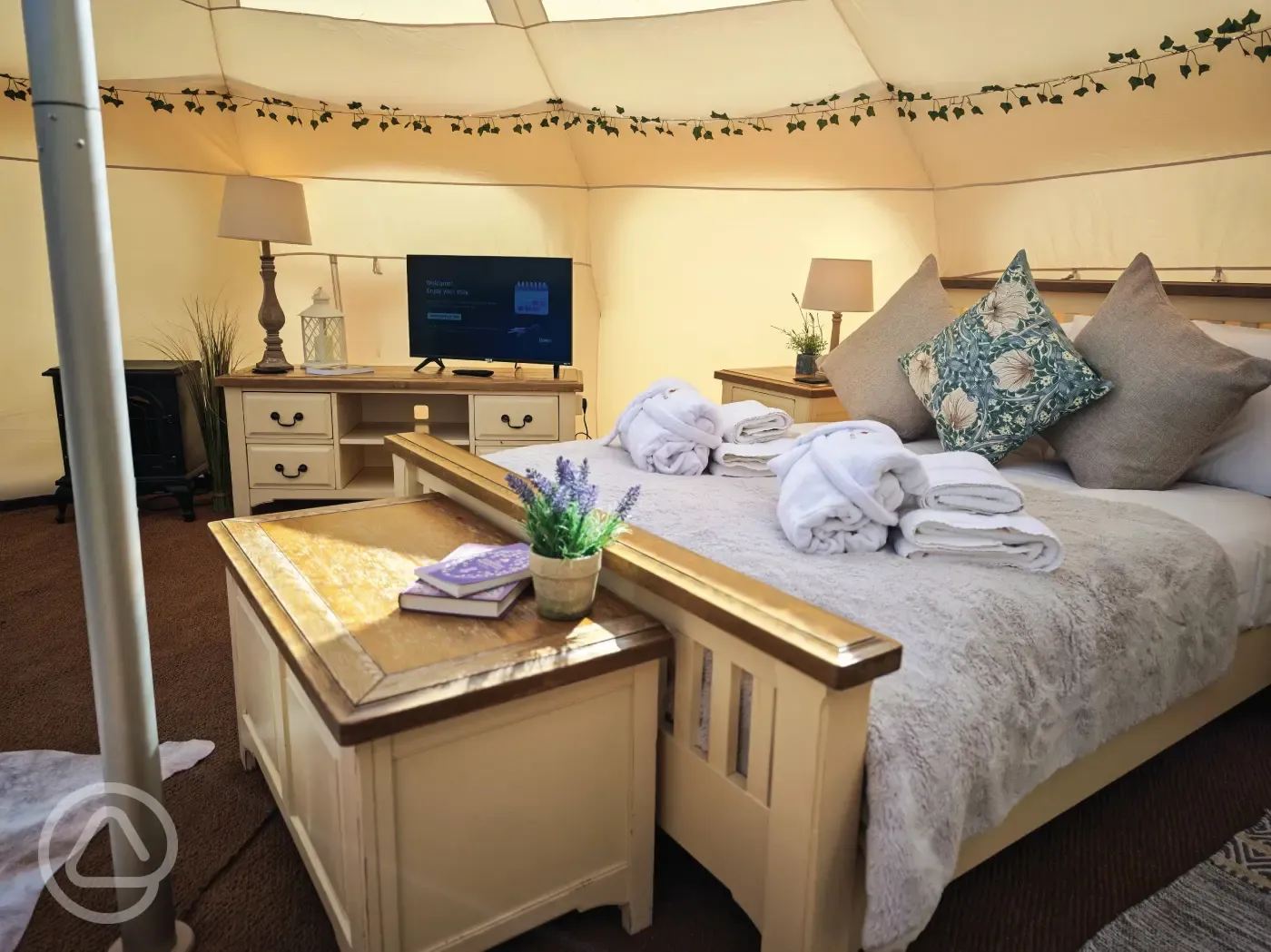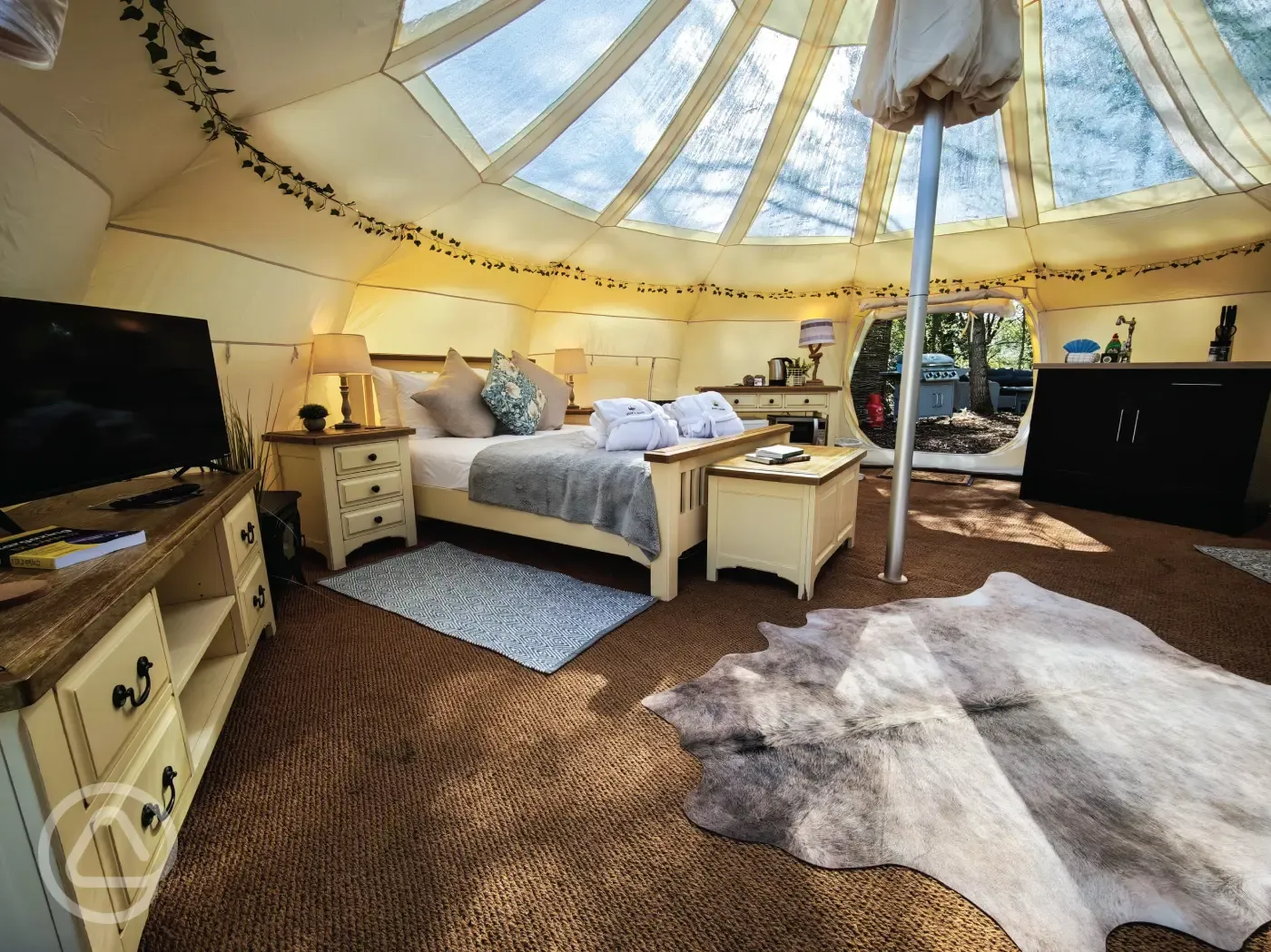 Stargazer bell tents equipped with a double bed, two single futons, TV, electric, heater and kitchen unit with a microwave, kettle and fridge. Outside garden area with a concrete table, hot tub, picnic bench, parasol and chimenea. Sorry, no pets.