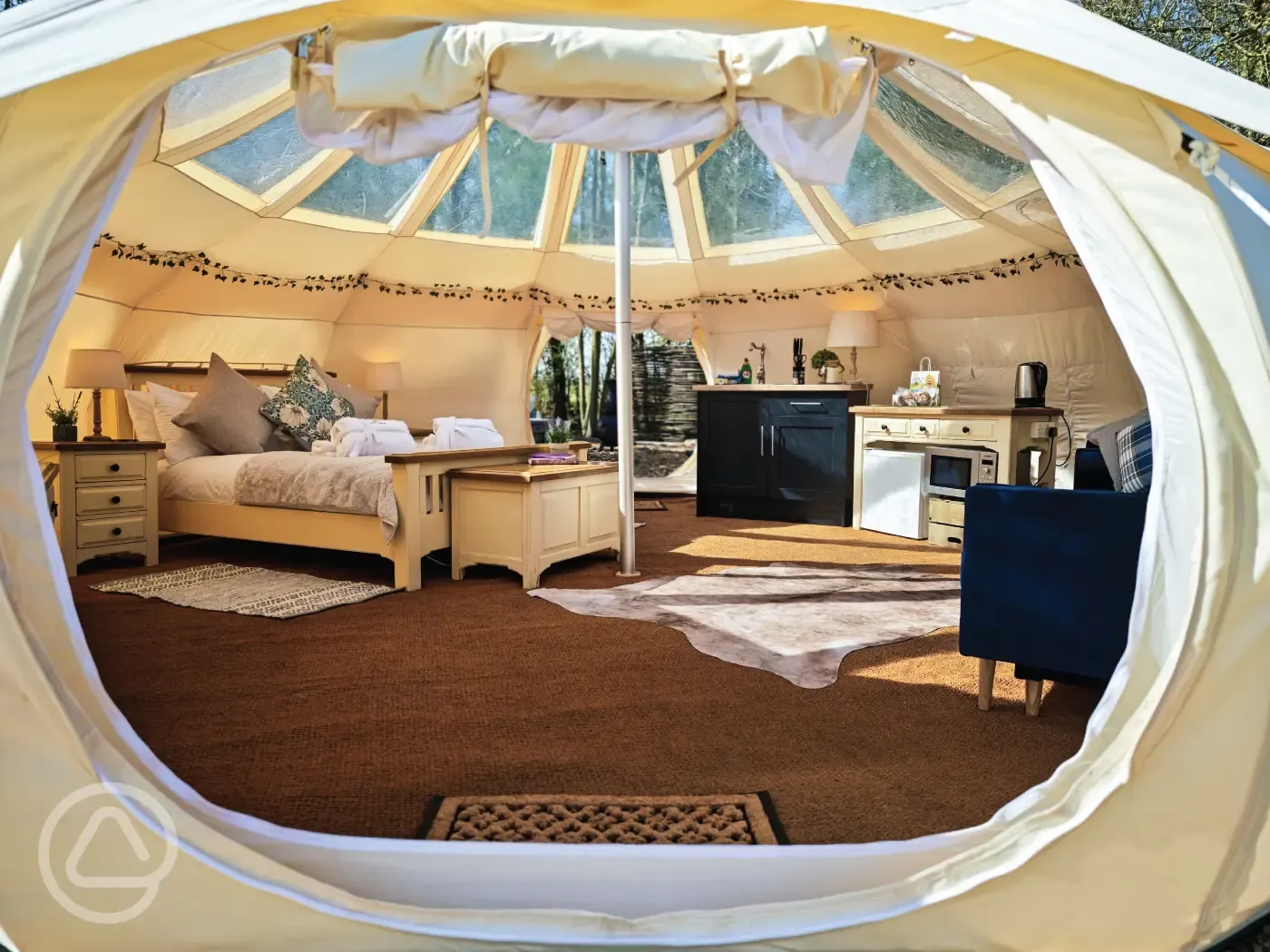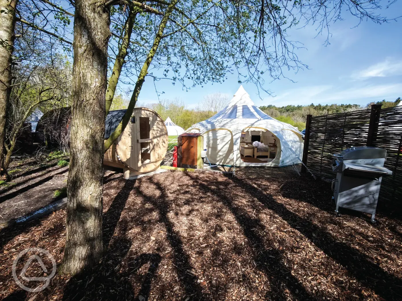 Stargazer bell tents equipped with a double bed, two single futons, TV, electric, heater and kitchen unit with a microwave, kettle and fridge. Outside garden area with a concrete table, sauna, picnic bench, parasol and chimenea. Sorry, no pets.