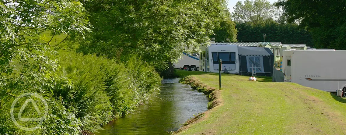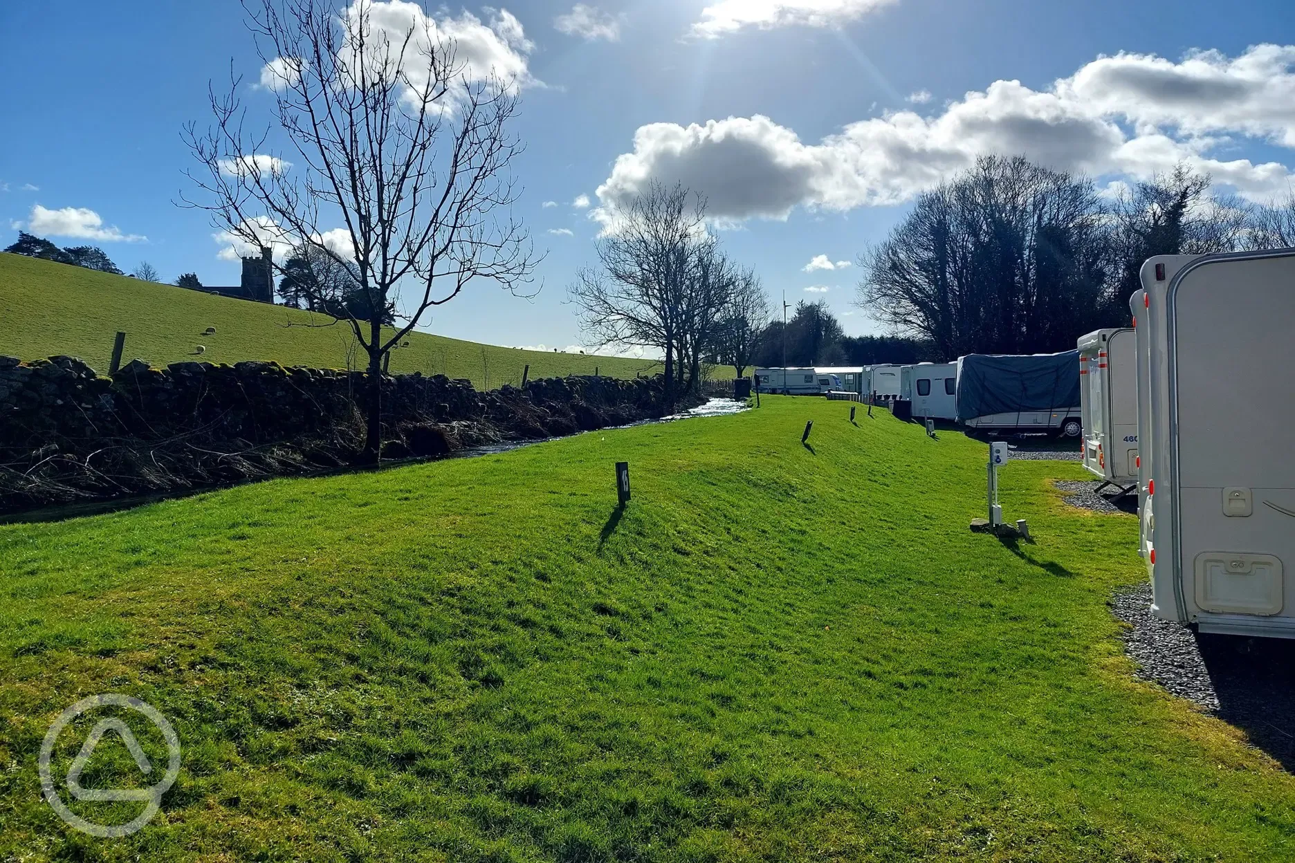 Spacious hardstanding pitches for touring, including electric hookup and nearby water taps and grey waste drains.