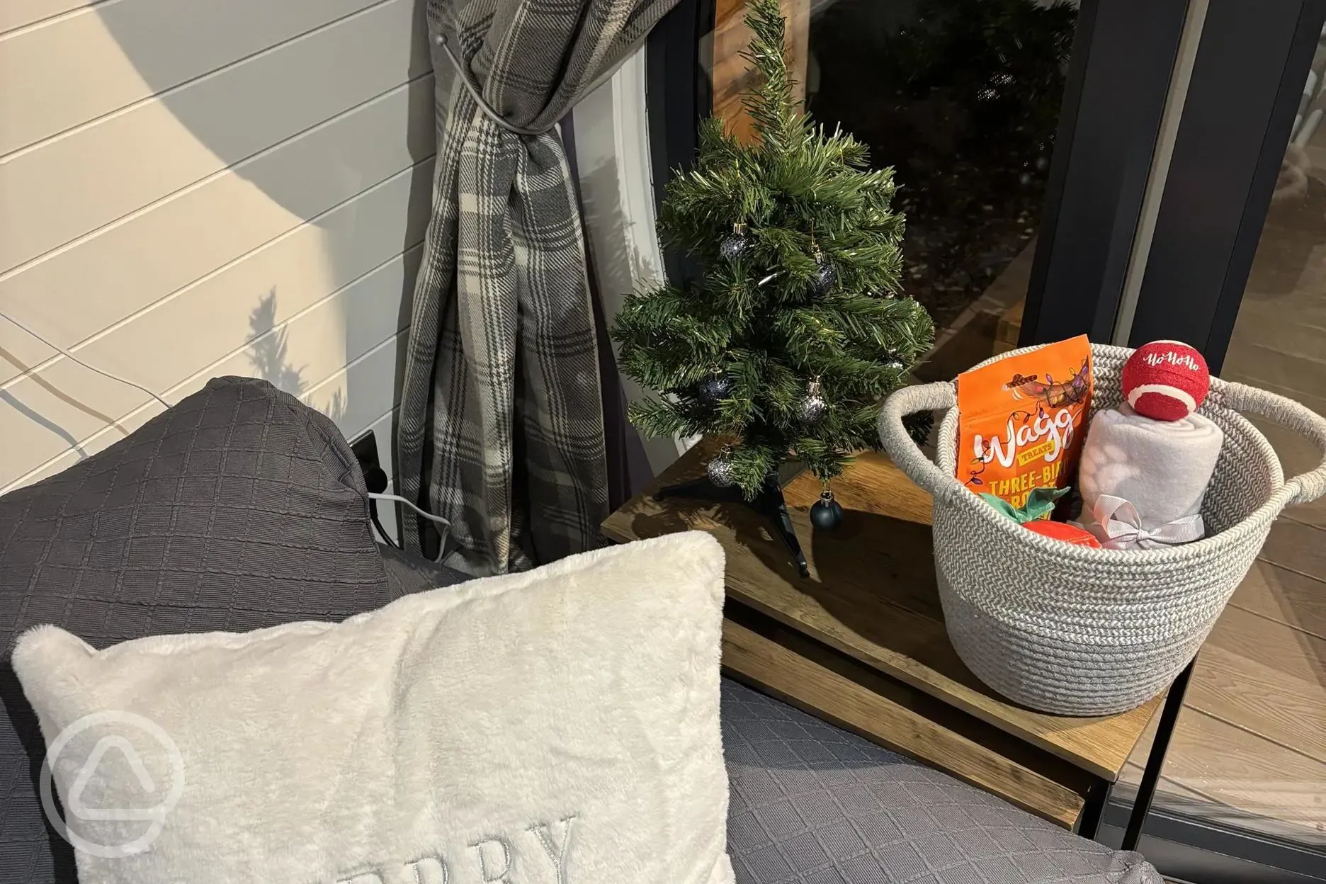 Treat you and your four-legged friend to a glamping stay in the scenic Mid Wales countryside. Designed with dogs in mind, the site includes an enclosed garden, doggy play park, and even doggy welcome baskets with treats and tennis balls. The site is currently home to one glamping pod, sleeping two with a double bed and double sofa. Bedding, linen and towels are all provided. In the kitchen area, you will find a sink, induction hob, microwave, fridge, kettle and toaster. Essentials like pans, crockery, utensils, salt and pepper, ketchup, mayo, washing up liquid and hand soap are provided, along with a breakfast bar for dining. Other modern features include a smart TV, WiFi, USB sockets and a smart radiator. To the back of your pod, you will find a wet room with a toilet, hand basin and shower. Outside, in your gated garden, you will have a fire pit, seating area and a sheltered hot tub for unwinding. When you arrive, you will be treated with a welcome hamper including tea, coffee, milk, a loaf of bread, butter, jam and Welsh cakes (depending on availability), the perfect way to start off your trip. The pod allows up to three dogs to join you for your stay!
