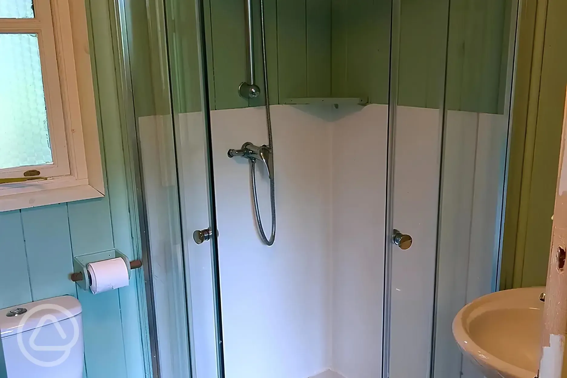 6m x 3m shepherd's hut in a secluded garden with a double bed, small kitchenette, heating and ensuite loo and shower. Outdoor kitchen, seating, fire pit and BBQ. Breakfast hamper included.