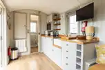 A cedar glamping lodge with all of the little luxuries, including king size bed, shower room with basin and toilet, kitchen facilities, TV and covered terrace. Plus, there's the added indulgence of an outdoor hot tub.