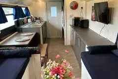 Converted double decker bus with a king bed, two singles, and two single sofa beds. There is a TV, fridge, kettle, microwave, air fryer and toaster. Please bring your own bedding. Picnic bench and awning outside. Shared facilities nearby. Pets welcome.
