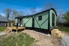 A train carriage replica complete with two double sofa beds that can transform into a dining area and a private decking with views over the site.