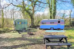 Includes a double bed and an eco toilet beside the touring caravan, as well as shared facilities nearby. Please bring bedding and towels. Outside is a fire pit and a picnic table. Dog friendly.