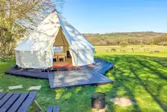 This site offers the ideal base for those seeking a coastal and countryside getaway. Blue Flag beaches, including Tenby North and Castle Beach, can be reached within a 25 minute drive, or visit the Preseli Hills in 40 minutes for scenic mountain walks. There are 14 spacious grass pitches for tents only, three of which include a 16 amp electric hook up. In dry weather, vehicles may be parked by the pitches. For larger families or groups, an optional electric woodland pitch is available for up to ten people, complete with a gazebo, fire pit and outdoor seating. A selection of bell tents sleeps two, three, or five guests. The Squirrel and Toad Bell Tents each come with their own camper's kitchen, equipped with crockery, cooking utensils and a stove. Please note that bedding and towels are not provided in any glamping unit. The farm is home to friendly alpacas, donkeys, pygmy goats, and more - all eager for feeding time and cuddles, which guests are welcome to participate in. There's also a small woodland area perfect for dogs to explore or little ones looking to build dens. Up to two dogs are welcome to join your stay on the pitches and in the glamping units. BBQs are permitted as long as they are raised off the ground. Gas BBQs are not allowed. If making a fire, the fuel, logs and coal must be purchased onsite.