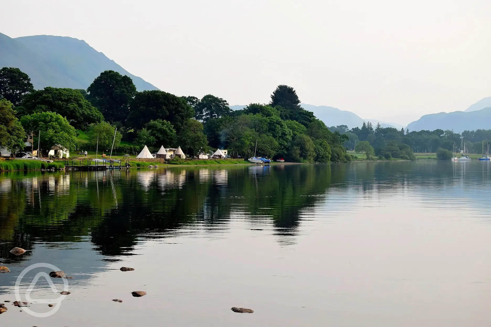 Lakeside campsite in the Lake District National Park with stunning views across Ullswater